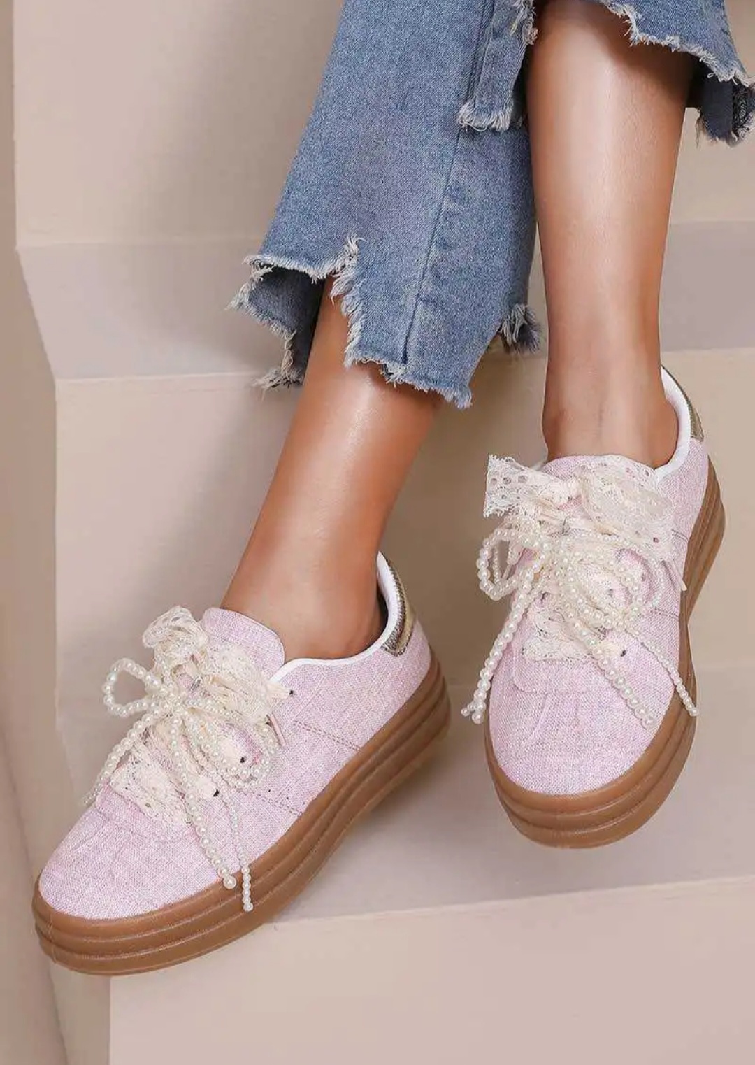 Baskets en tissu rose poudré, lacets dentelle, perles amovibles et semelles plates-formes.