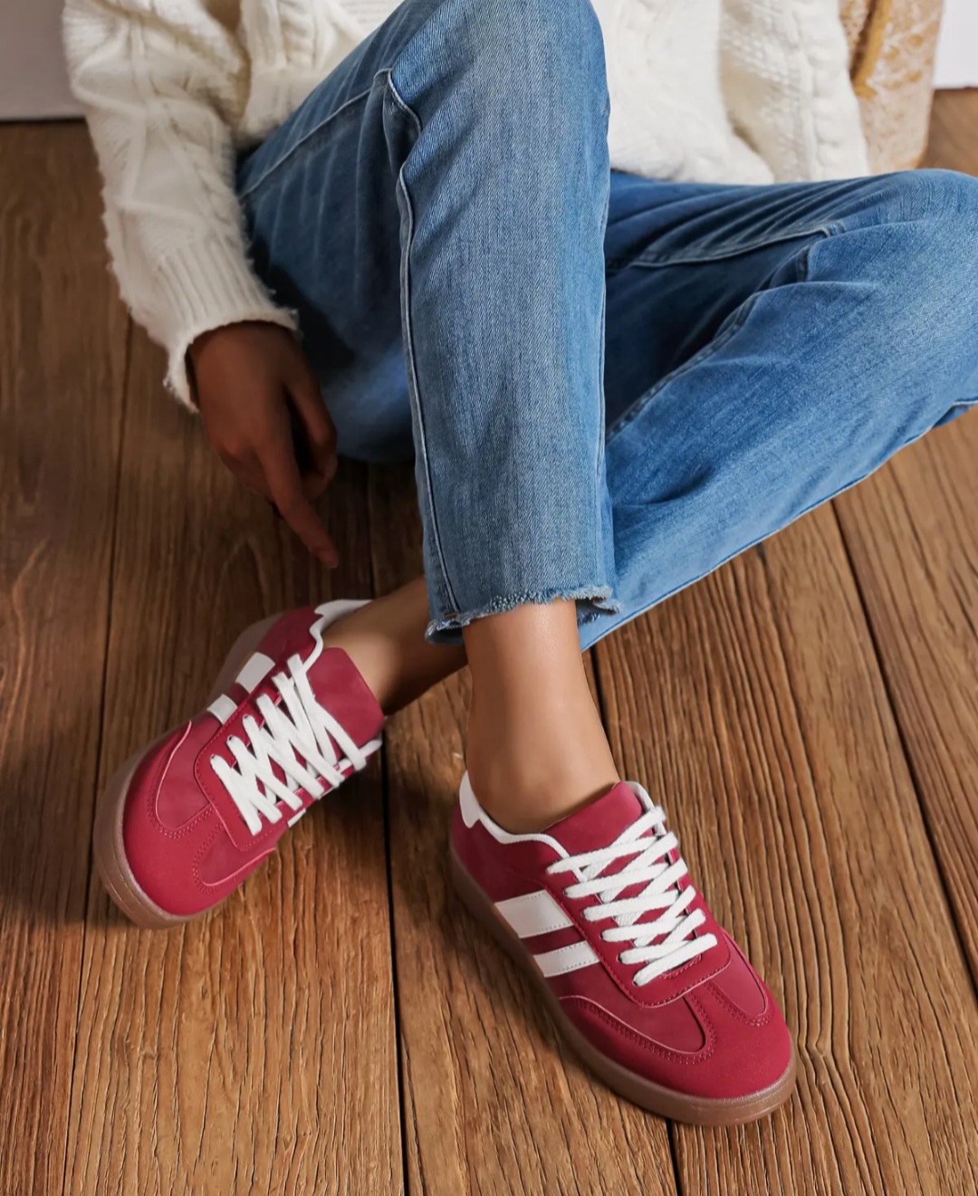 Baskets en suédine bordeaux avec deux liserés blancs, légères et ultra confortables.