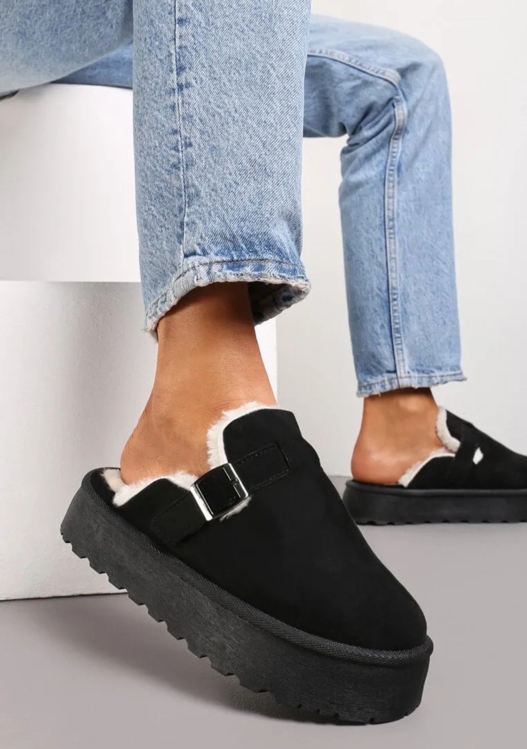 Claquettes noires en simili daim, boucle réglable, intérieur fourré blanc et semelles épaisses.